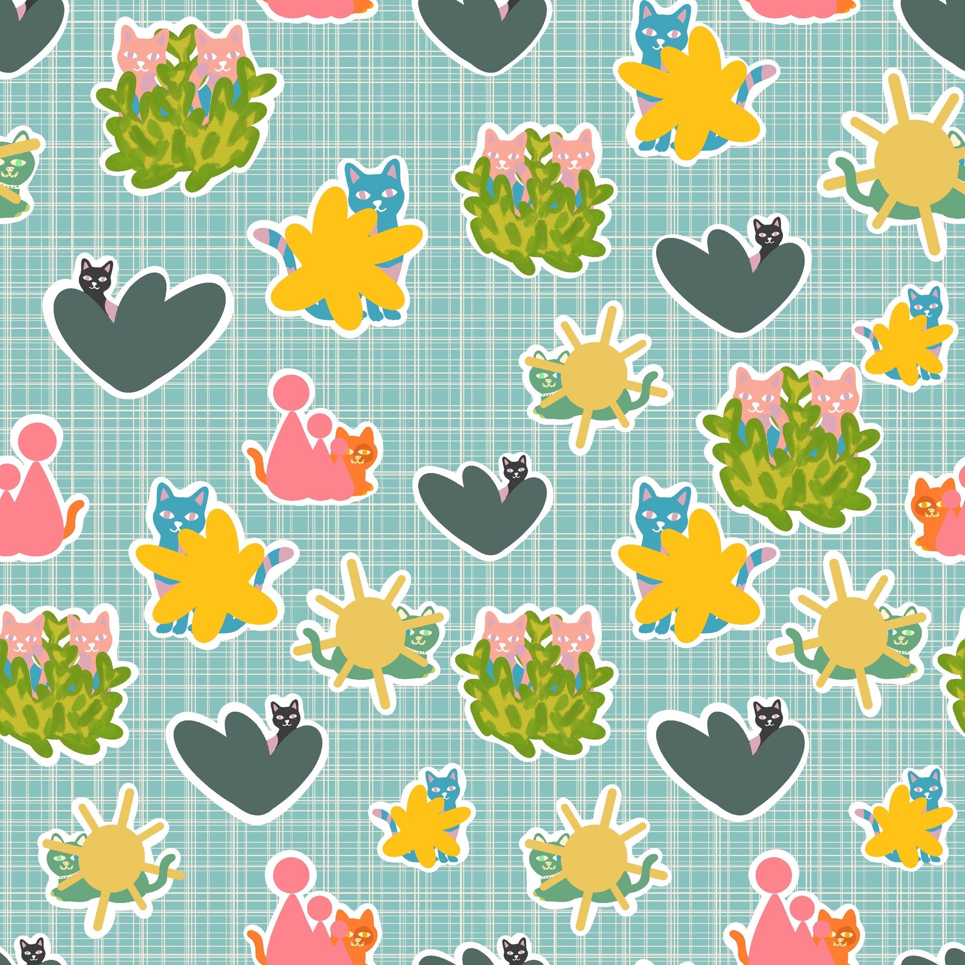 Der Stoff Versteckte Katzen ist reiner Spaß. Auf einem modernen Gitterhintergrund erleben wir ein echtes Abenteuer: neugierige Katzen, Büsche und strahlende Sonnen. Ein Muster zum Bedrucken von Stoff mit liebevollen Details.