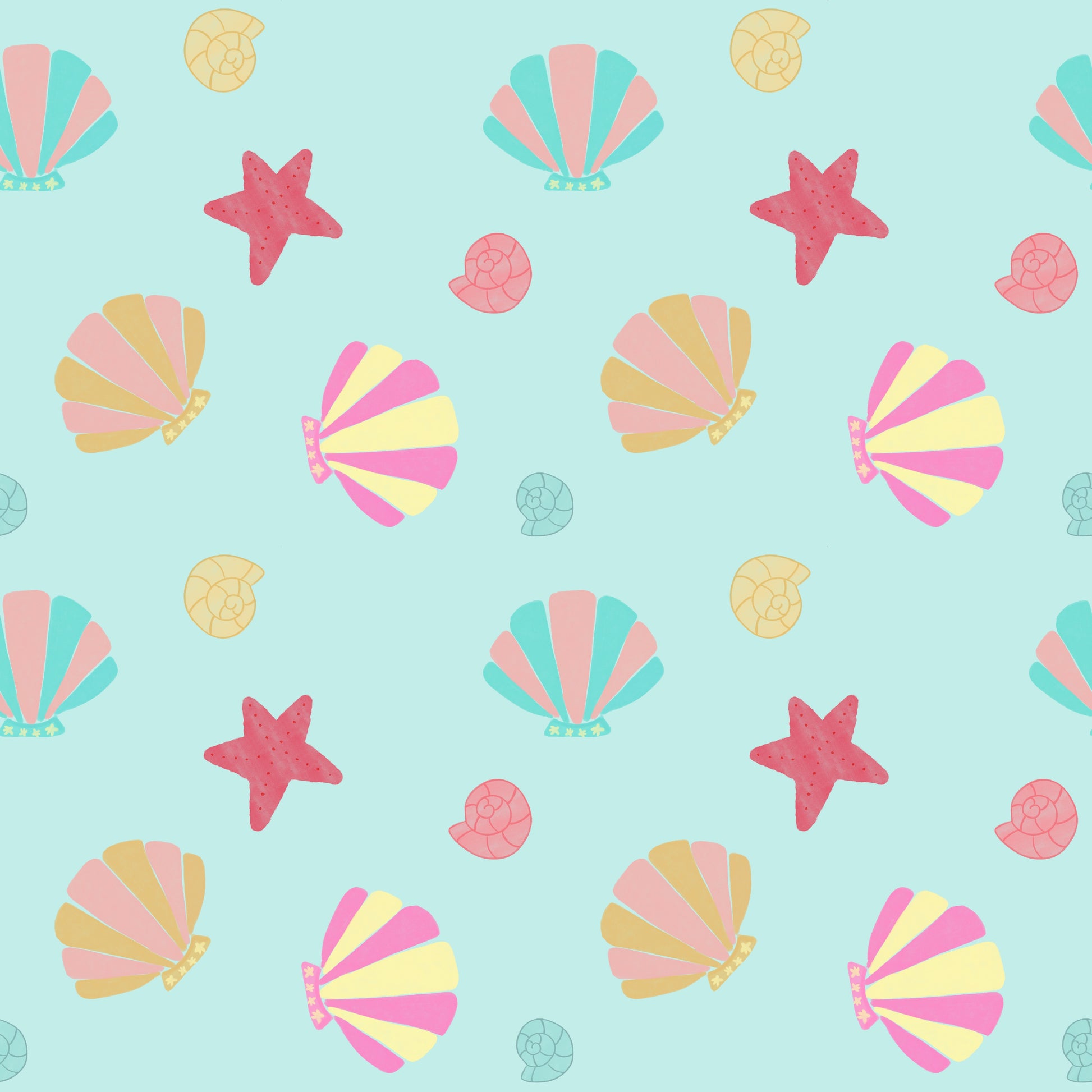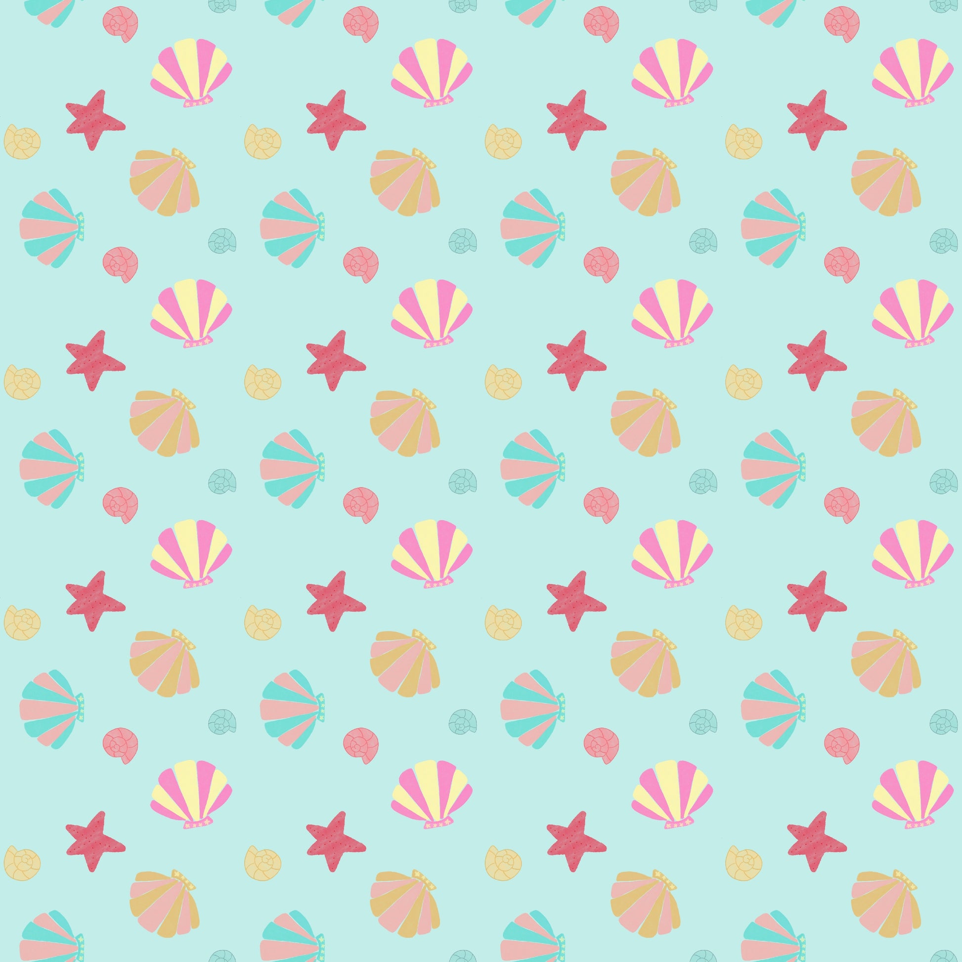 Mermaids, where are you? 🧜🐚 This pattern brings the seabed to your sewing machine, but with a super sweet pastel palette. Shells, conchs, and starfish on a water blue background that makes us dream of beach days. Ideal for summer toiletry bags, waterproof beach bags, children's and adults' poufs, or even light dresses.