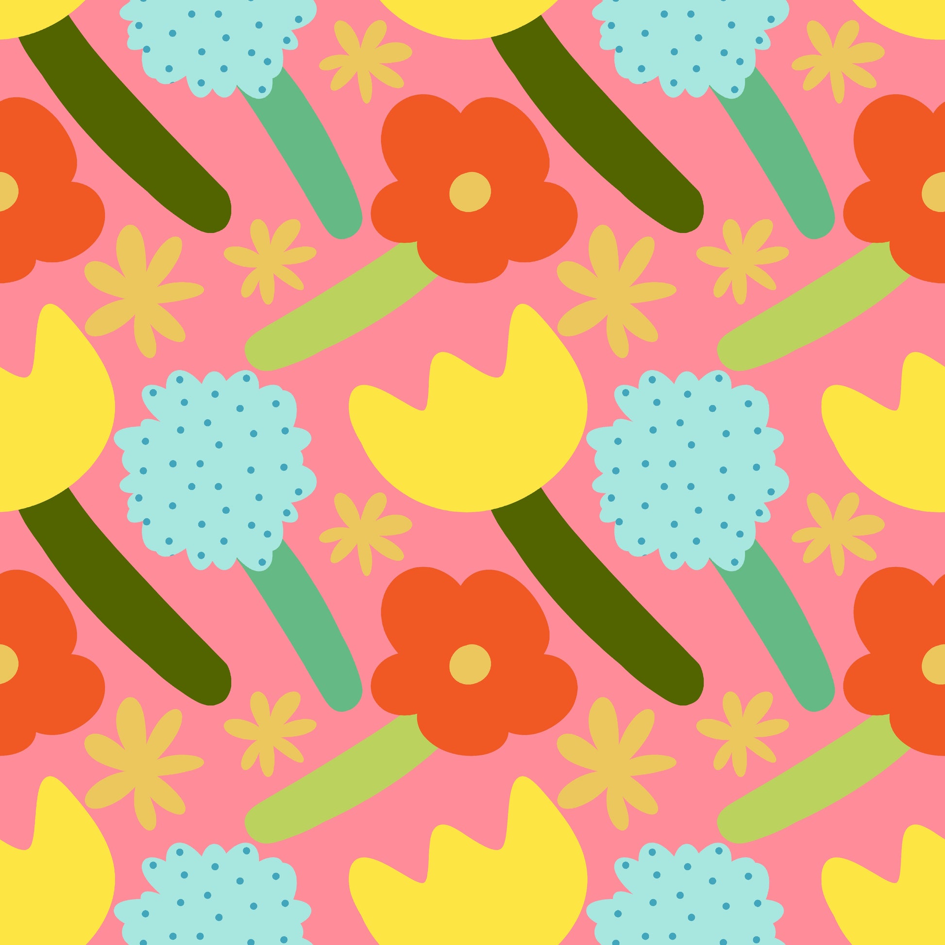 Una vibra casi de collage, con colores primarios vibrantes sobre un fondo rosa fuerte. Es una tela alegre y artística. Como el diseño es grande y espacioso, queda especialmente bonito en piezas con cierta área, como pufs, vestidos sueltos, cortinas para un espacio creativo o, por ejemplo, bolsas grandes.
