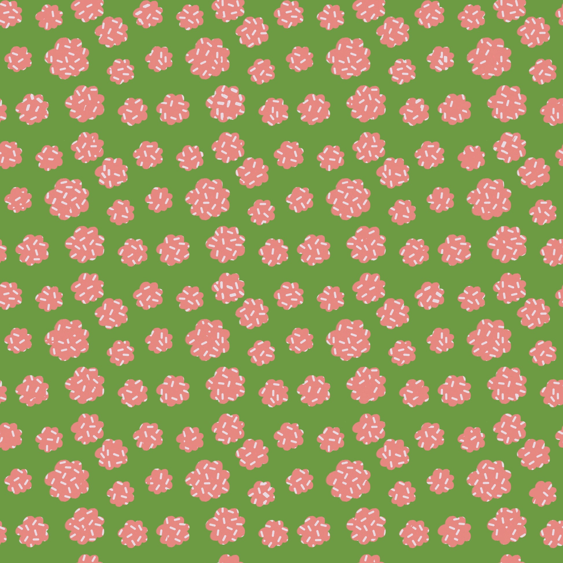 Las formas orgánicas en rosa destacan muy bien sobre el fondo verde hierba, creando un contraste divertido y moderno. Si buscas alejarte de los florales tradicionales, esta es una excelente alternativa. Tiene una escala simpática para proyectos pequeños como neceseres, estuches o bolsas, donde se puede apreciar bien el juego de colores.