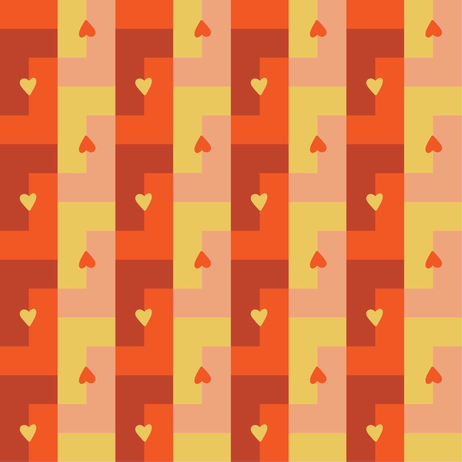 Geometria a blocchi con cuori in evidenza, mix autunnale e divertente.