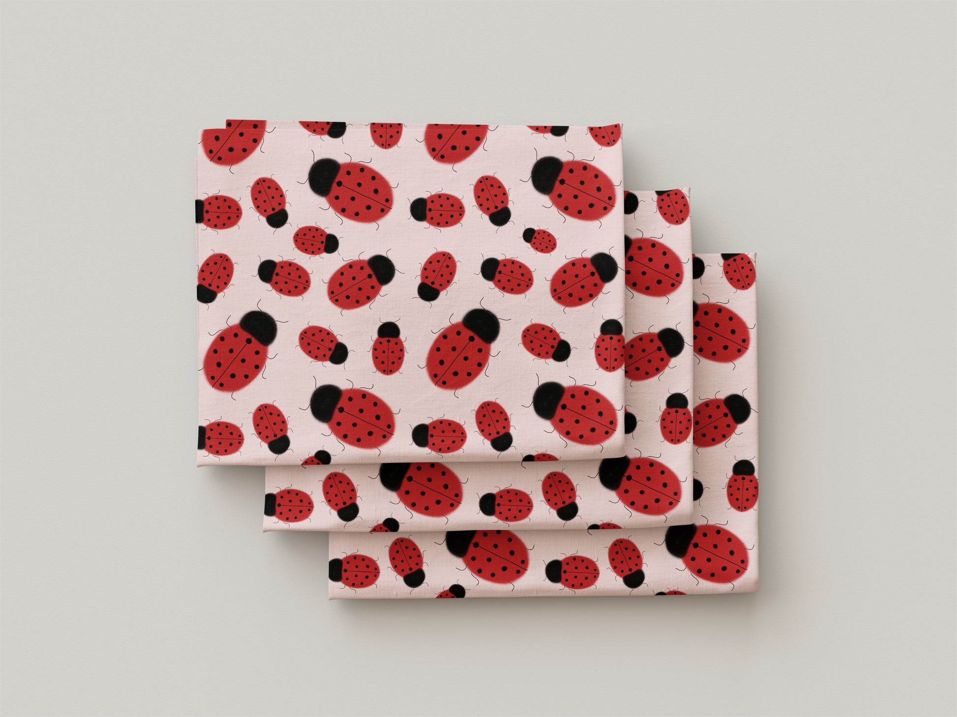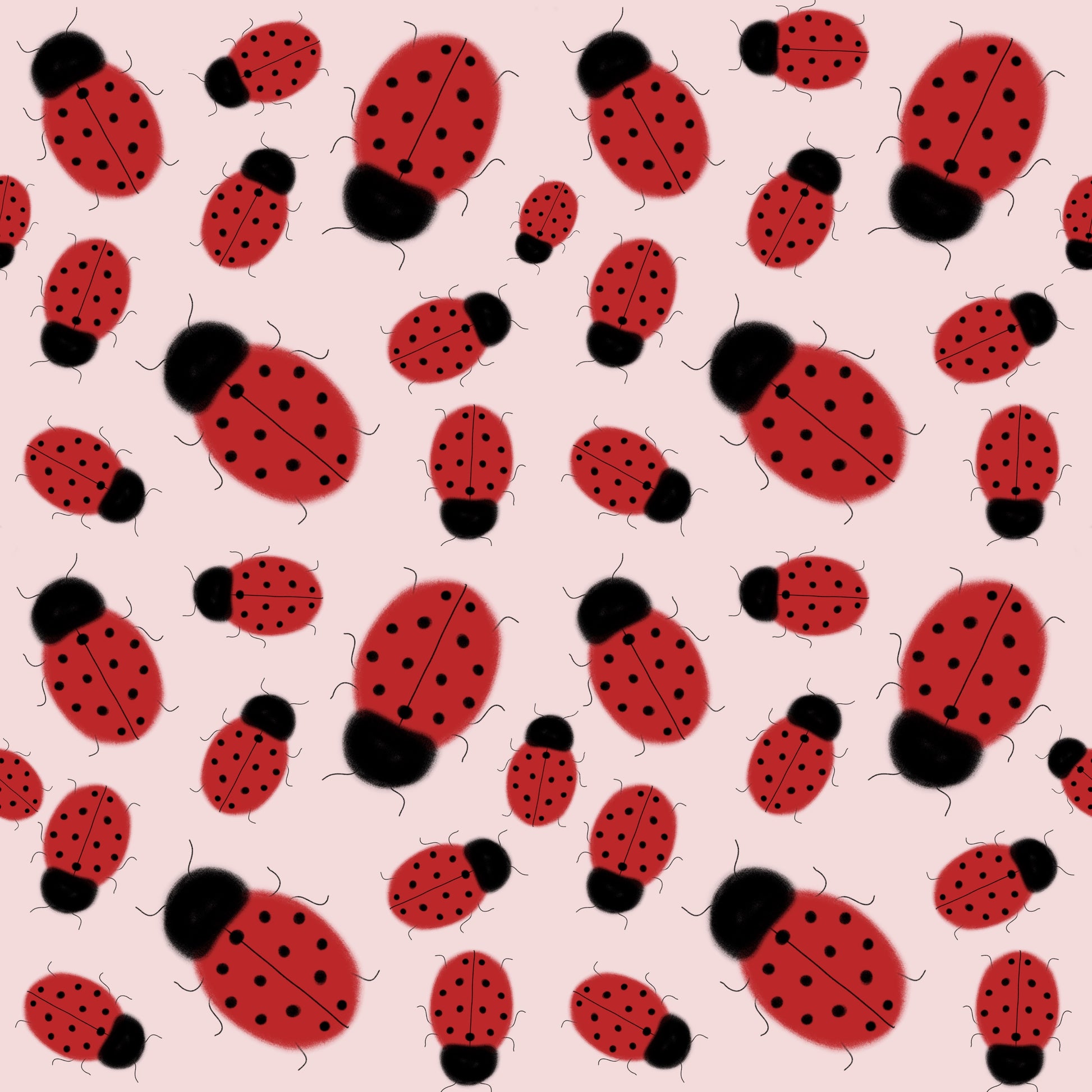 Coccinelle di diverse dimensioni su sfondo rosa chiaro.