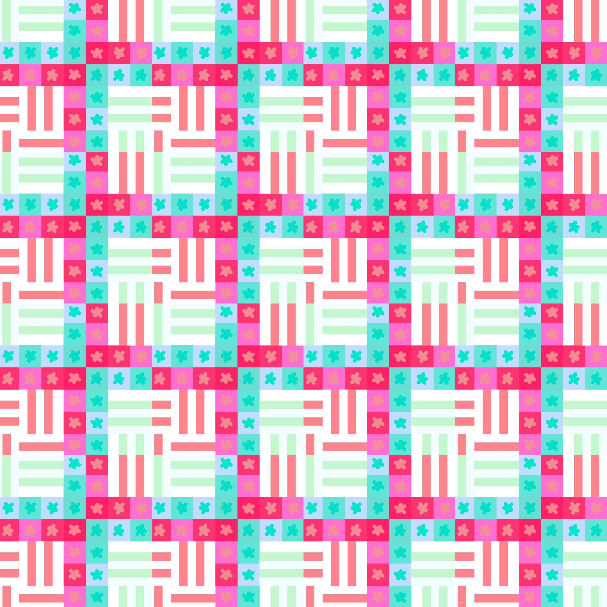 Un motivo per la sublimazione su tessuto che consiste in un grande mosaico divertente in cui fiori e forme geometriche danzano in armonia.