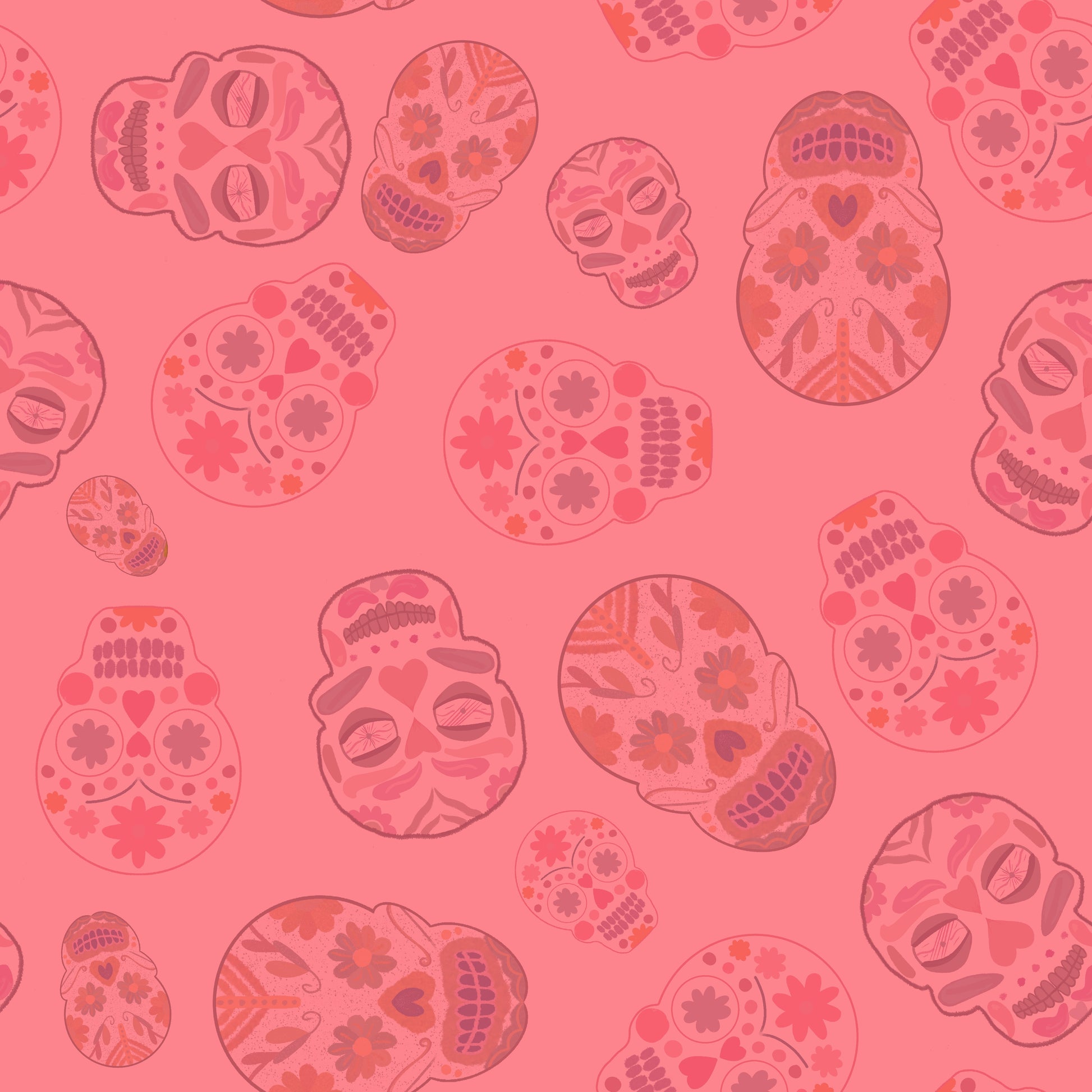 Tessuto con teschi colorati diversi e sovrapposizione rosa.