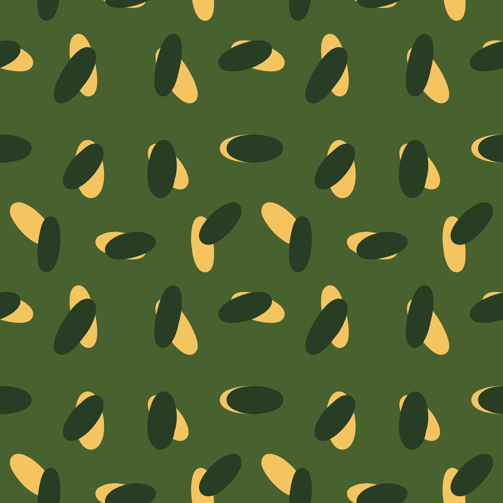 Forme ovali ripetute in verde scuro e giallo su sfondo verde.