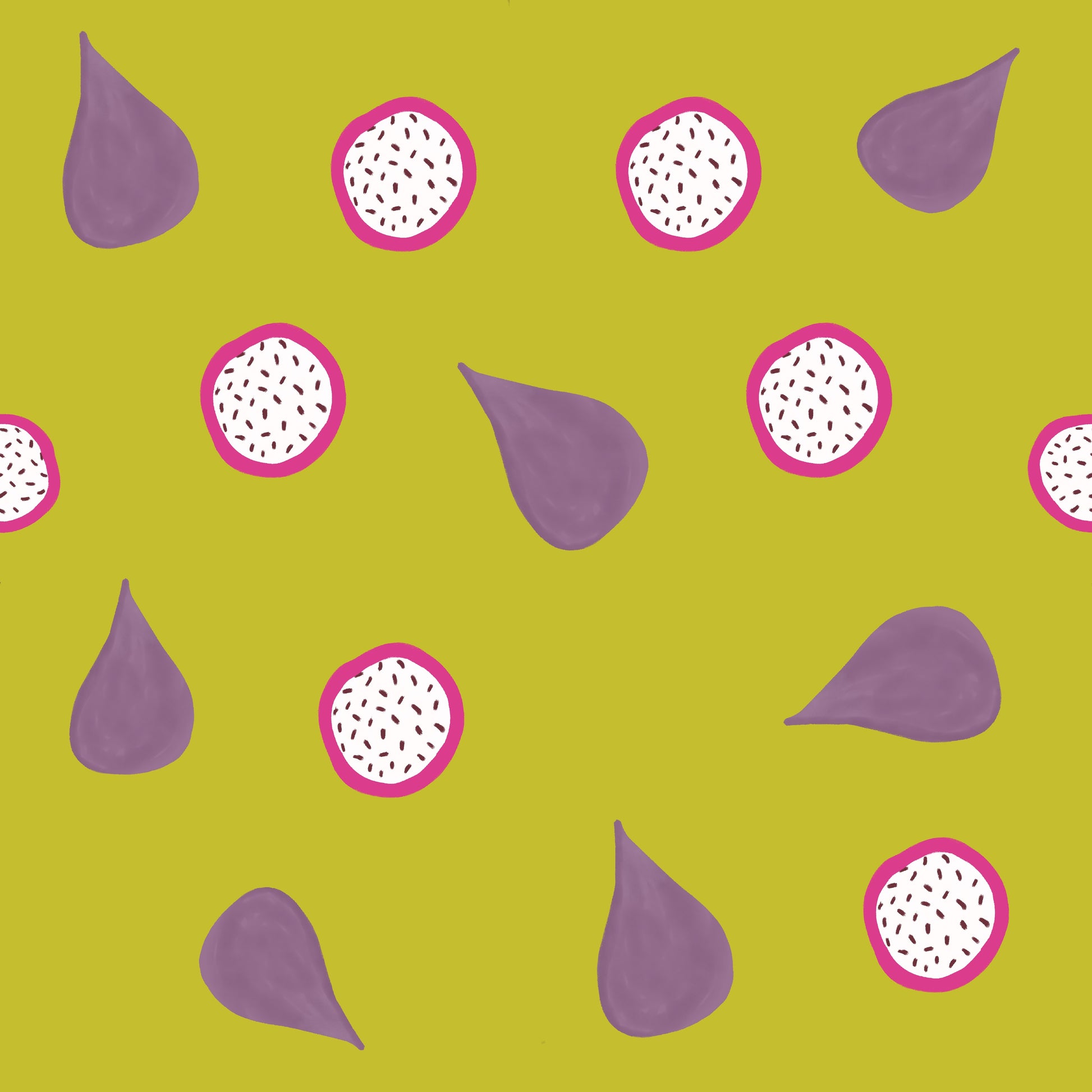 De natuur in haar meest levendige versie. Vergeet de traditionele fruitpatronen. Pitaya's en Exotische Vijgen is een patroon dat het vertrouwde met het exotische mengt: paarse vijgen en fuchsia pitaya's steken af tegen een super trendy groene achtergrond.