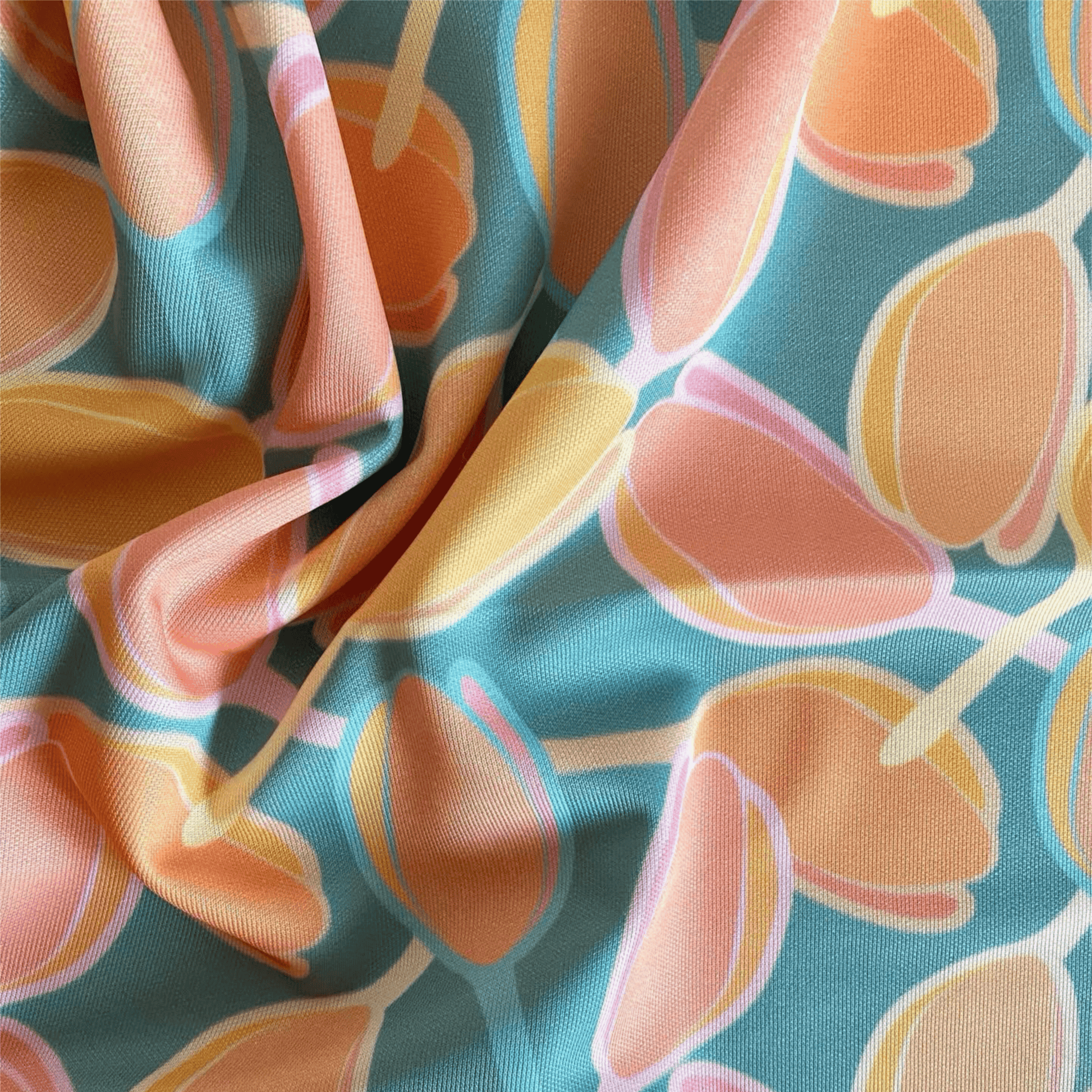 Stof met tulpenbloemen in diverse rustgevende kleuren op een blauwe achtergrond.