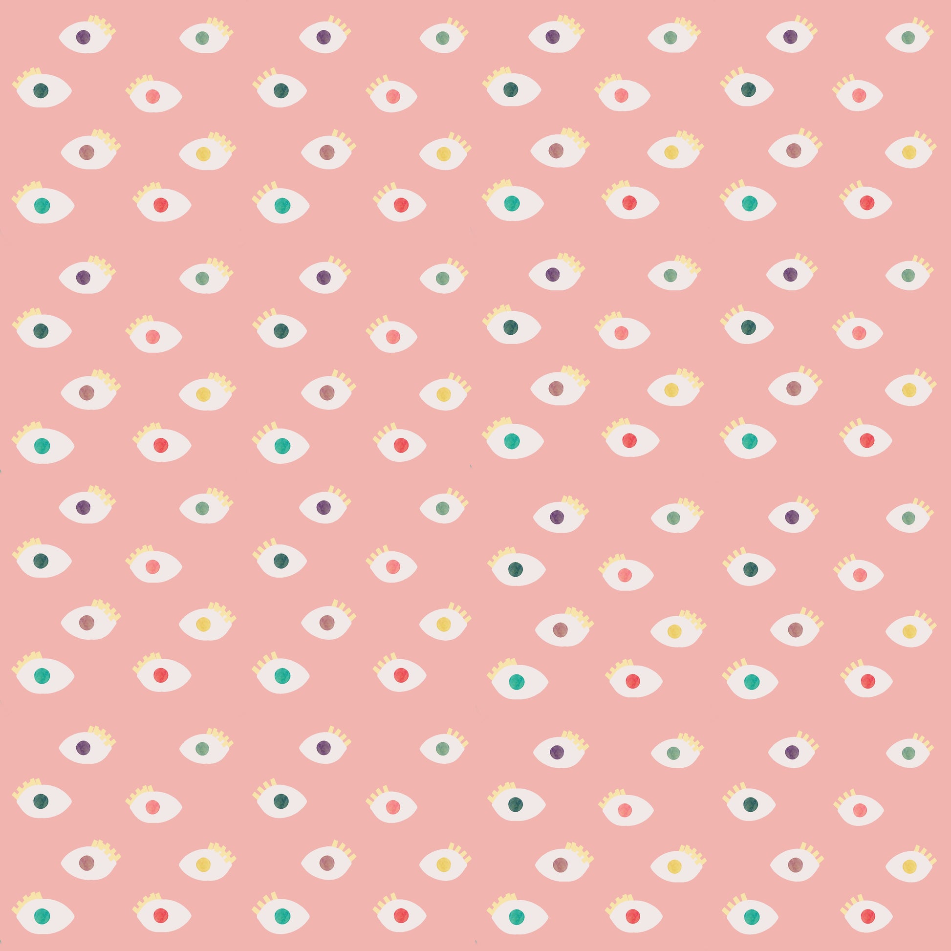 Olhos com iris de várias cores em fundo rosa claro. Um padrão amoroso que dá para todas as estações, assim como para todas as idades.