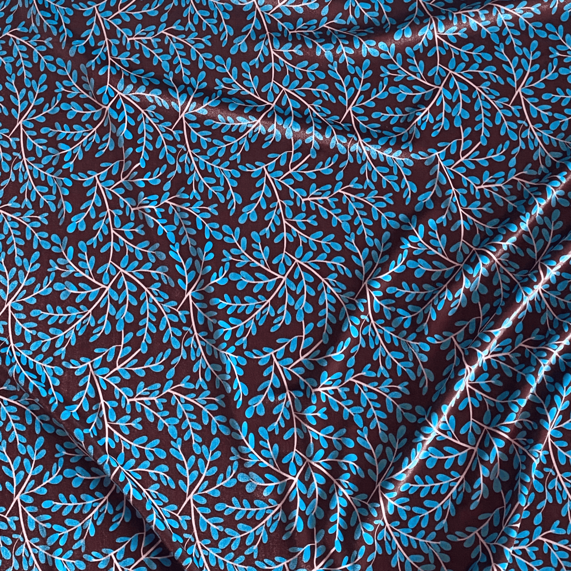 Ramos e folhas estilizadas em azul sobre fundo castanho.