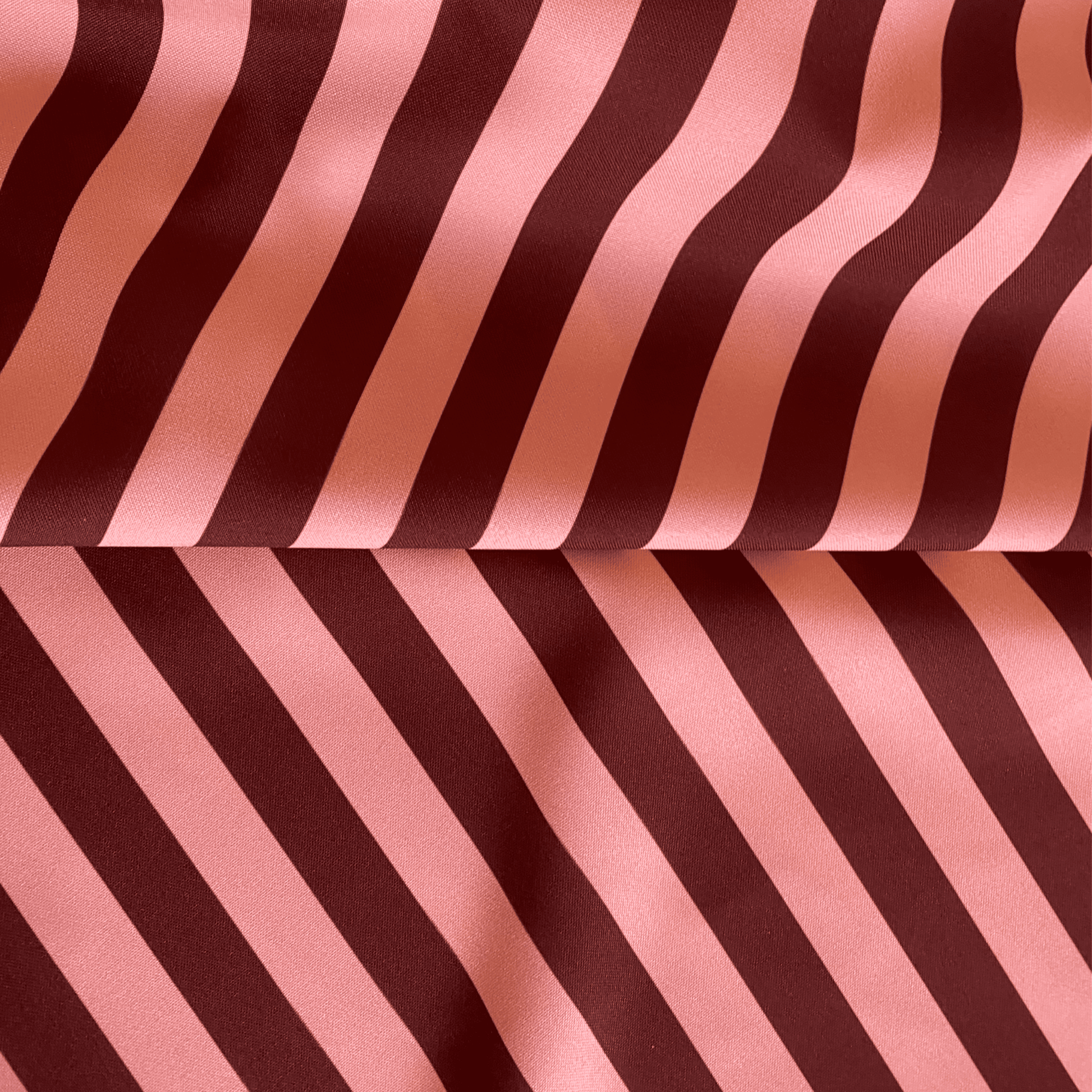 Tecido com padrão des riscas em castanho e rosa. Risas de diferentes larguras.